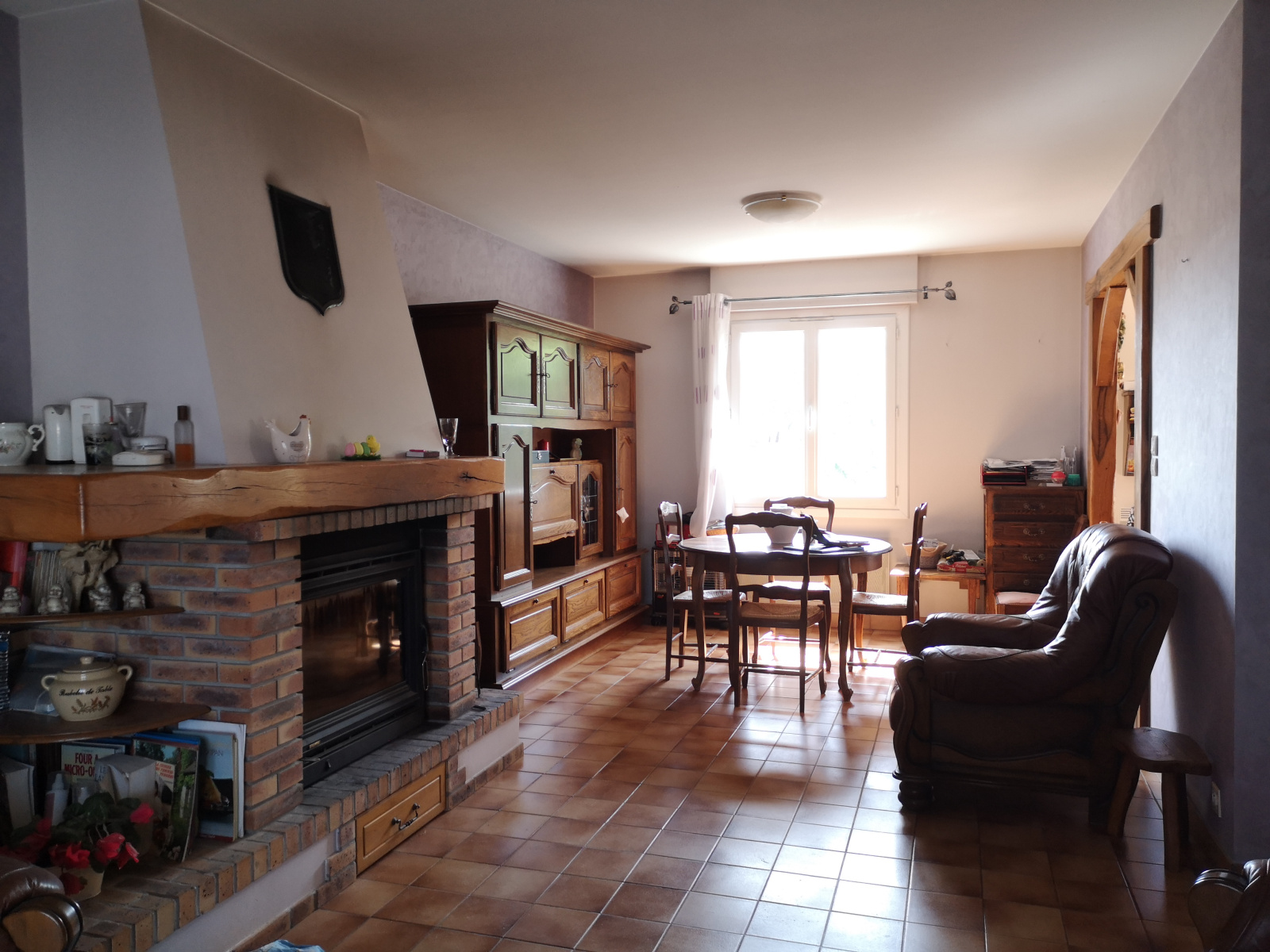 Composée d'un hall d'entrée donnant sur une pièce de vie avec une cheminée insert, une cuisine aménagée, 3 chambres, une salle de bain douche/baignoire et un wc.